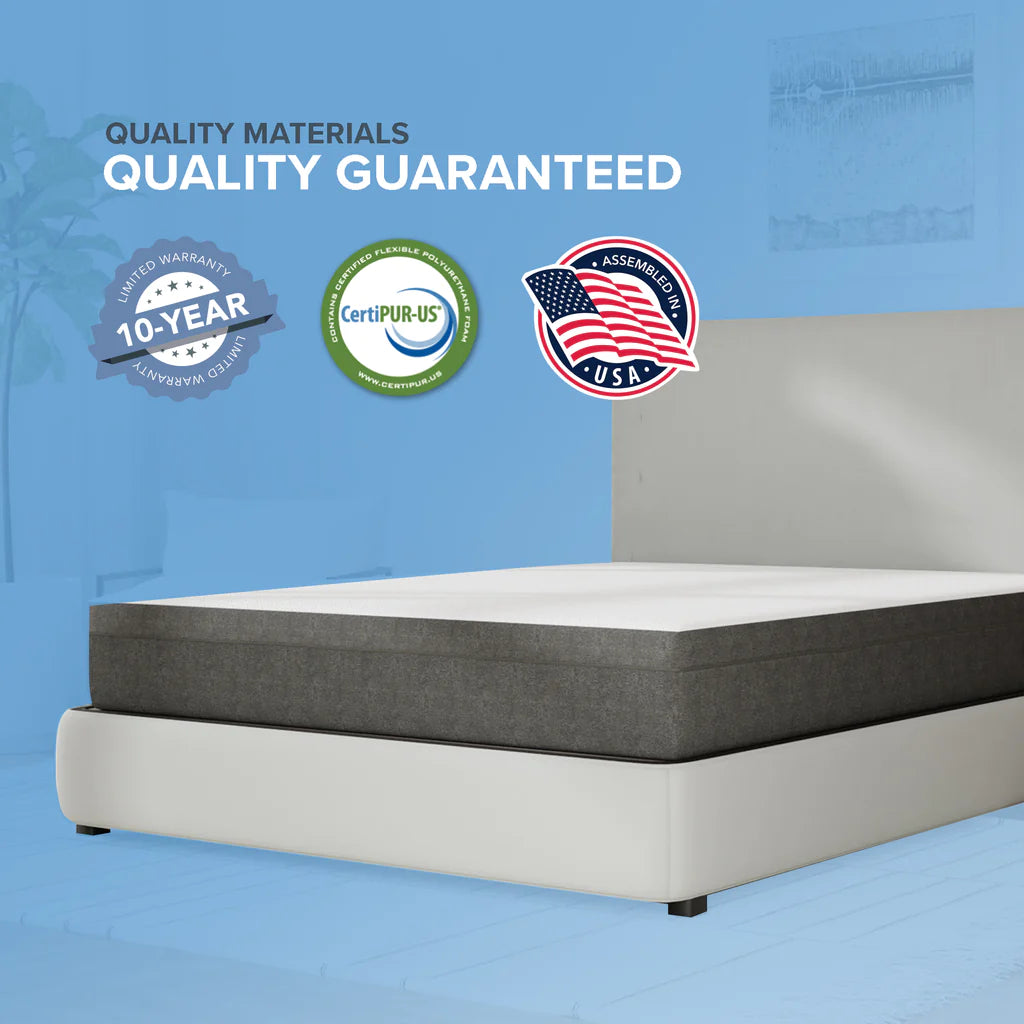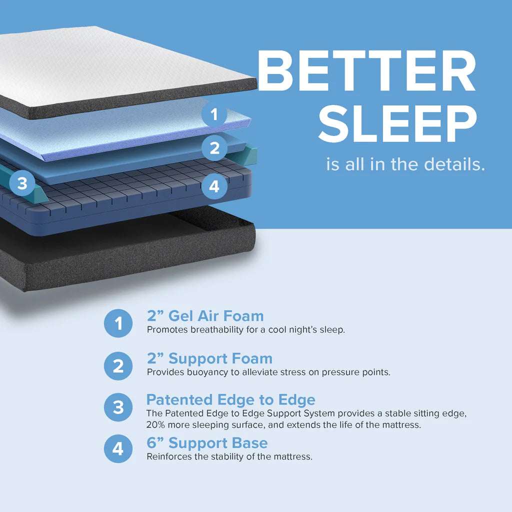 The 10” Pressure Free Mattress combines premium materials to deliver optimal comfort and support. Designed to naturally conform to your body, it promotes proper circulation and spinal alignment. The top layer of Gel Air Memory Foam enhances airflow, while the Support Foam alleviates stress on pressure points with buoyant comfort.