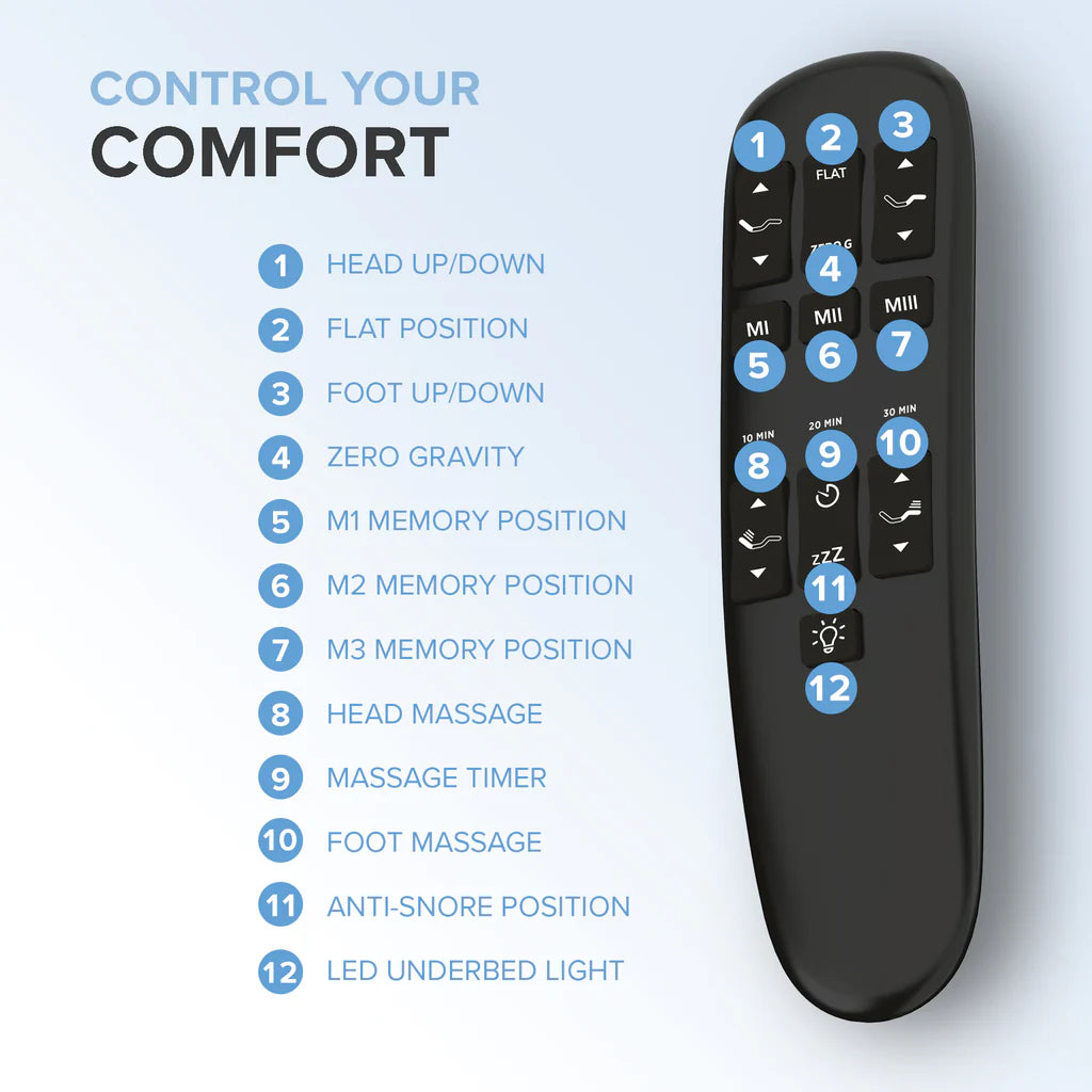 - Programmable Preset Positions: Includes anti-snore, zero gravity, flat, and three additional customizable settings.